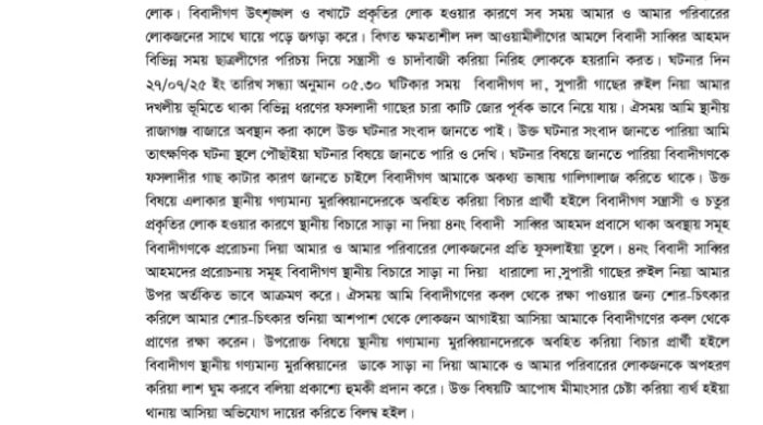 গত ২৬/০৭/২০২৫ তারিখে সাদেক আহমেদ রাজাগঞ্জ বাজারে অবস্থানকালে ছাইয়ারা বেগম, হোসাইন আহমেদ ও সামুল আহমেদ মিলে তার লাগানো গাছ ও চারা কেটে ফেলতে থাকে। খবর পেয়ে সাদেক ঘটনাস্থলে গেলে তারা অশ্লীল ভাষায় গালাগালি করে এবং ধারালো দা ও সুপারি গাছের লাঠি দিয়ে তাকে আক্রমণ করে। তার চিৎকার শুনে স্থানীয় দুদু মিয়া চৌধুরী (৭০), লজন মিয়া চৌধুরী (৫০), নজরুল ইসলাম চৌধুরী (৪০)সহ প্রতিবেশীরা ঘটনাস্থলে পৌঁছালে সাদেকের প্রাণ রক্ষা হয়। তবে গাছ ও চারাগুলো কেটে উপড়ে ফেলে তারা নিজেদের বাড়ির ভেতরে নিয়ে যায়।
