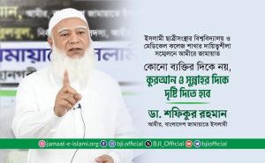 গত ১ মে গাজীপুর জেলার সফিপুরে বাংলাদেশ ইসলামী ছাত্রীসংস্থার বিশ্ববিদ্যালয় ও মেডিকেল কলেজ শাখার দায়িত্বশীল সম্মেলনে প্রধান অতিথির বক্তব্যে বাংলাদেশ জামায়াতে ইসলামীর আমীর ডা. শফিকুর রহমান বলেন, “তোমাদের প্রতি আমার তিনটি পরামর্শ- প্রথমত, কোনো ব্যক্তির প্রতি নয়, কুরআন ও সুন্নাহর দিকে দৃষ্টি দিতে হবে। কুরআন পাঠ করতে হবে ইখলাসের সাথে, কোনো মান রক্ষা বা রিপোর্ট রাখার জন্য নয়। দ্বিতীয়ত, পরিবার ও আহলে কারীবের হক আদায় করতে হবে। বিবাহিতদের জন্য প্রথম হক স্বামীর খেদমত করা, আর অবিবাহিতদের জন্য প্রথম হক পিতামাতার খেদমত করা। এর সাথে আত্মীয়, প্রতিবেশী ও পরিচিতদের হক আদায় করতে হবে। তৃতীয়, ছাত্রীদের মধ্য থেকে ছাত্রীদের সমস্যা সমাধান করতে পারে এমন একদল যোগ্য লোক তৈরি করতে হবে।