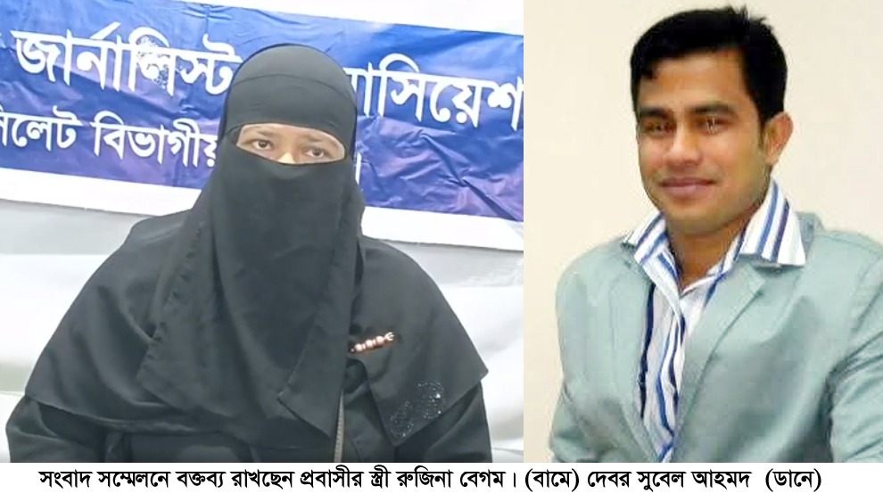 সংবাদ সম্মেলনে রুজিনা বেগম জানান, তিনি বিশ্বনাথ উপজেলার মোকামবাড়ী গ্রামের মখলিছ আলীর পুত্র প্রবাসী ব্যক্তির স্ত্রী। তার স্বামী দীর্ঘ ২৭ বছর ধরে সৌদি আরবে প্রবাস জীবনযাপন করছেন। দেশে ফিরে ২০২১ সালে রুজিনা বেগমকে বিয়ে করেন তিনি। এ সময় প্রবাসে অর্জিত অর্থ পরিবারের কাছে হিসাব চাইলে পরিবারের সদস্যরা গড়িমসি শুরু করেন। পরে স্থানীয় সালিশে প্রমাণ হয় যে, প্রবাসে থাকাকালীন সময়ে স্বামী পরিবারের সদস্যদের হাতে প্রায় ২৯ লাখ টাকা দিয়েছেন।