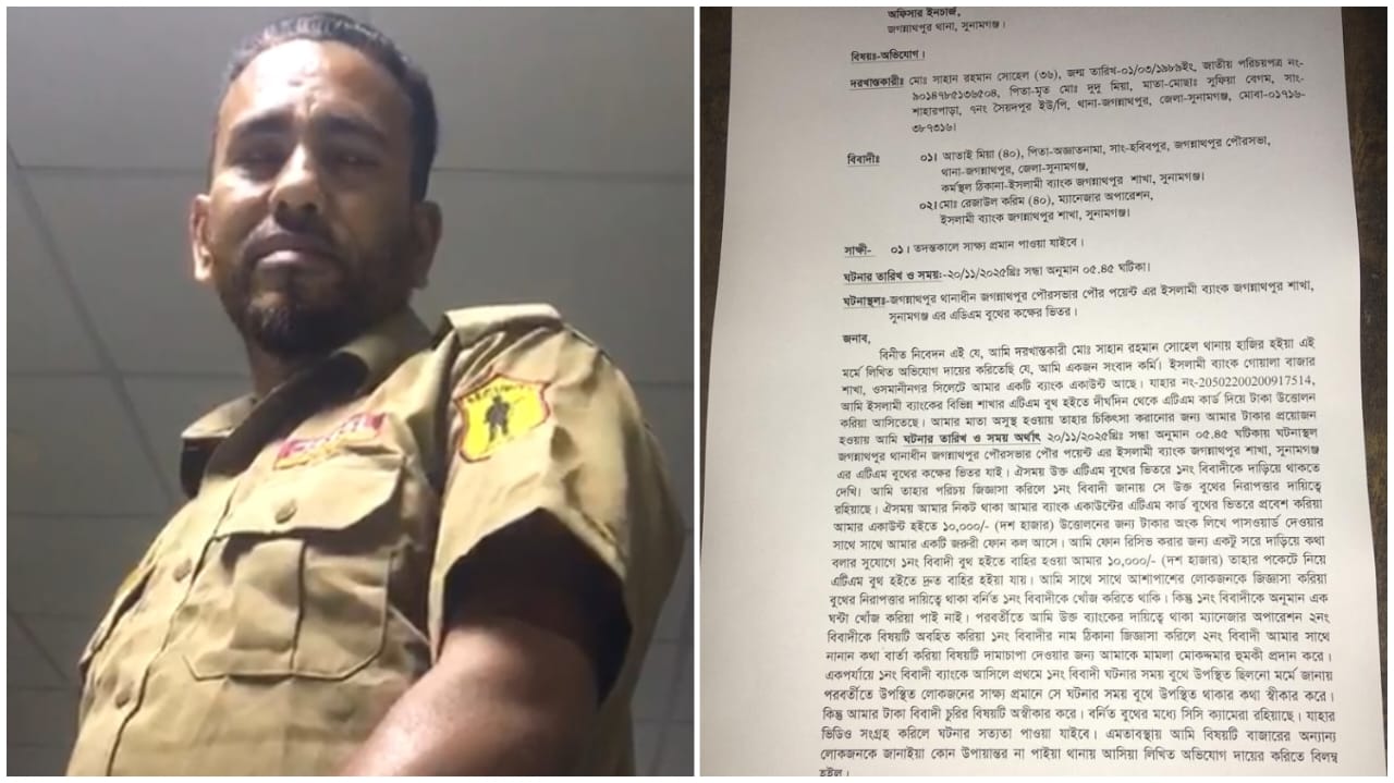 জগন্নাথপুরে এটিএম বুথে সাংবাদিকের ১০ হাজার টাকা গায়েব, নিরাপত্তাকর্মী ও ম্যানেজারের বিরুদ্ধে অভিযোগ তাহিরপুর (সুনামগঞ্জ) প্রতিনিধি: সুনামগঞ্জের জগন্নাথপুরে ইসলামী ব্যাংকের একটি এটিএম বুথ থেকে দৈনিক আলোর সকাল (অনলাইন)–এর সহ-বার্তা সম্পাদক মোঃ সাহান রহমান সোহেলের ১০ হাজার টাকা আত্মসাতের অভিযোগ উঠেছে ব্যাংকেরই নিরাপত্তাকর্মীর বিরুদ্ধে। এ ঘটনায় নিরাপত্তাকর্মী ও শাখা ম্যানেজারের বিরুদ্ধে জগন্নাথপুর থানায় লিখিত অভিযোগ দায়ের করেছেন তিনি। অভিযোগে বলা হয়, বৃহস্পতিবার (২০ নভেম্বর ২০২৫) সন্ধ্যা সাড়ে ৫টায় পৌর পয়েন্টস্থ ইসলামী ব্যাংকের এটিএম বুথে টাকা তুলতে যান সাংবাদিক সোহেল। বুথে ঢুকেই তিনি পোশাকবিহীন একজন ব্যক্তিকে দাঁড়িয়ে থাকতে দেখেন। পরিচয় জানতে চাইলে তিনি নিজেকে নিরাপত্তাকর্মী আতাই মিয়া (বাড়ি—হবিবপুর) বলে পরিচয় দেন। এসময় সাংবাদিক সোহেল ১০ হাজার টাকা উত্তোলনের প্রক্রিয়া শুরু করলে তাঁর মোবাইলে জরুরি ফোন আসে। তিনি পাশে সরে কথা বলার ফাঁকে মেশিন থেকে বের হওয়া টাকার বান্ডেল আতাই মিয়া হাতিয়ে নিয়ে দ্রুত বুথ ত্যাগ করেন। আশপাশের লোকজনসহ প্রায় এক ঘণ্টা খোঁজাখুঁজি করেও তাকে পাওয়া যায়নি। ঘটনার পর সাংবাদিক সোহেল বিষয়টি ইসলামী ব্যাংক জগন্নাথপুর শাখার ম্যানেজার (অপারেশন) মোঃ রেজাউল করিমকে জানালে তিনি অভিযোগকে ভিন্ন দিকে নেওয়ার চেষ্টা করেন এবং মামলা-মোকদ্দমার ভয়ভীতি প্রদর্শন করেন বলে অভিযোগে উল্লেখ রয়েছে। পরবর্তীতে সাংবাদিক পরিচয় দেওয়ায় ম্যানেজার অভিযুক্ত নিরাপত্তাকর্মীকে শাখায় ডাকেন। আতাই মিয়া বুথে থাকার কথা স্বীকার করলেও টাকা নেওয়ার বিষয়টি অস্বীকার করেন। সাংবাদিক সোহেল অভিযোগ করেন সিসিটিভি ফুটেজ দেখার অনুরোধ করলেও ম্যানেজার জানান হেড অফিস থেকে ফুটেজ আনতে ২–৩ মাস সময় লাগবে। আমি ভিডিও ধারণ করলে তিনি ক্ষিপ্ত হয়ে নিরাপত্তাকর্মীকে মোবাইল কেড়ে নেওয়ার নির্দেশ দেন। আমি তখনই থানায় গিয়ে অভিযোগ করি। তিনি আরও দাবি করেন, বুথের সিসিটিভি ফুটেজ সংগ্রহ করলে পুরো ঘটনার সত্যতা নিশ্চিত হওয়া সম্ভব। তাঁর মোবাইলে ব্যাংকের স্বয়ংক্রিয় বার্তায় ওই সময় টাকা উত্তোলনের বিষয়টি নিশ্চিত হয়েছে। স্থানীয়দের অভিযোগ, এটিএম বুথে যে মানুষ রক্ষার দায়িত্বে থাকে, সেই নিরাপত্তাকর্মীই যদি গ্রাহকের টাকা নিয়ে পালায়—তাহলে ব্যাংকিং নিরাপত্তা প্রশ্নবিদ্ধ হয়ে পড়ে। ইসলামী ব্যাংক জগন্নাথপুর শাখার ম্যানেজার (অপারেশন) মোঃ রেজাউল করিমের কাছে বিষয়টি জানতে চাইলে তিনি বলেন, টেকনিক্যাল সমস্যার কারণে হয়তো টাকা বের হয়নি। বিষয়টি হেড অফিসে জানানো হয়েছে। তিন–চার দিনের মধ্যেই সমাধান হবে। জগন্নাথপুর থানার নবাগত ওসি (তদ