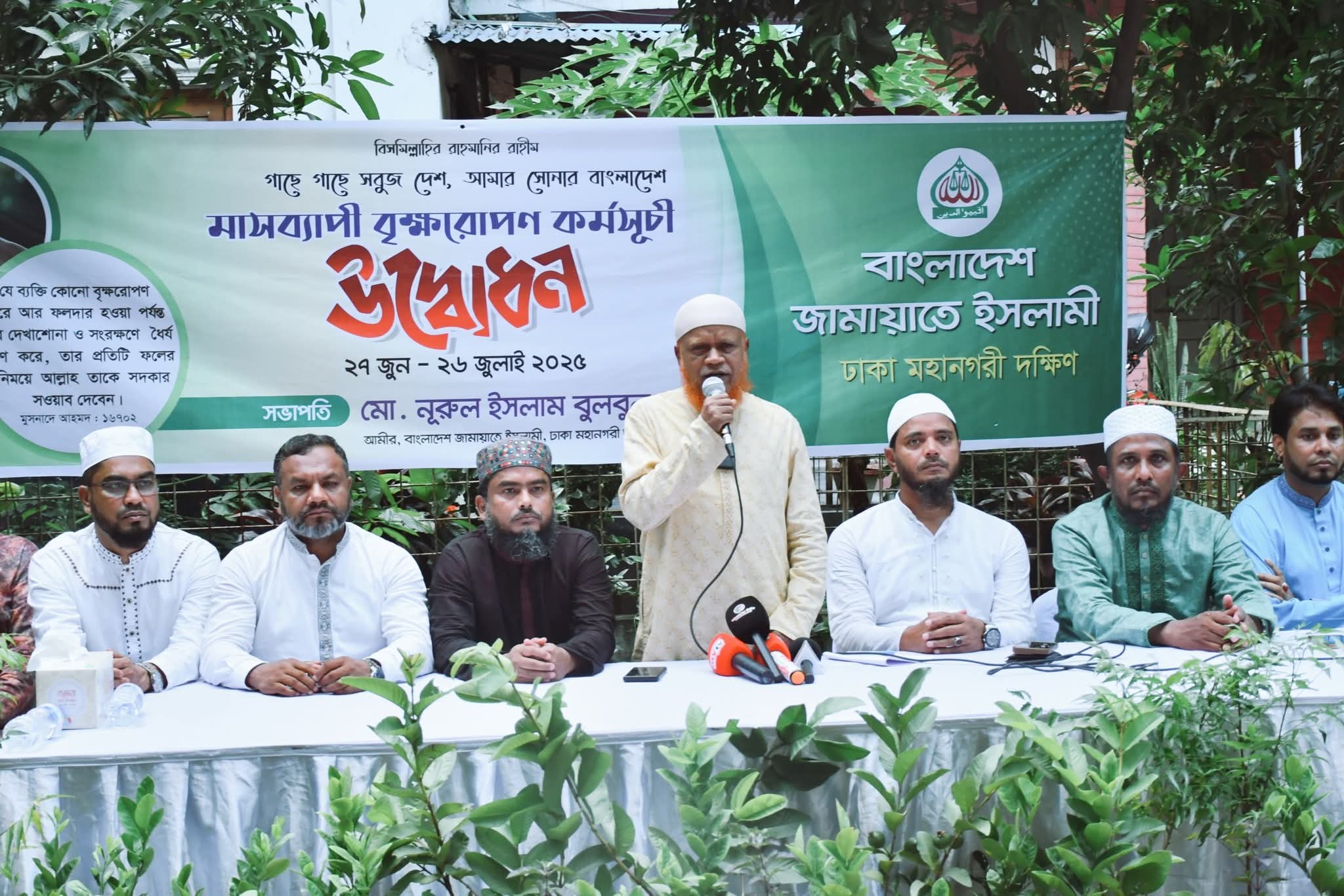 বাংলাদেশ জামায়াতে ইসলামী ঢাকা মহানগরী দক্ষিণের উদ্যোগে মাসব্যাপী বৃক্ষরোপণ কর্মসূচির উদ্বোধনী অনুষ্ঠানে সভাপতির বক্তব্যে কেন্দ্রীয় নির্বাহী পরিষদ সদস্য ও ঢাকা মহানগরী দক্ষিণের আমীর মো. নূরুল ইসলাম বুলবুল বলেছেন, নিরাপদ ও বাসযোগ্য ঢাকা গড়তে রাজধানীতে ১০ লাখ গাছ রোপণ করবে জামায়াতে ইসলামী। এসময় তিনি আরো বলেন, পরিবেশের সুরক্ষায় সামাজিক বনায়ন ও পারিবারিক পুষ্টি বাগান গড়ে তুলতে হবে। জামায়াতে ইসলামী রাষ্ট্র পরিচালনার সুযোগ পেলে দেশের প্রতিটি নাগরিকের জন্য নিরাপদ ও বাসযোগ্য নগরায়ন গড়ে তোলা হবে।