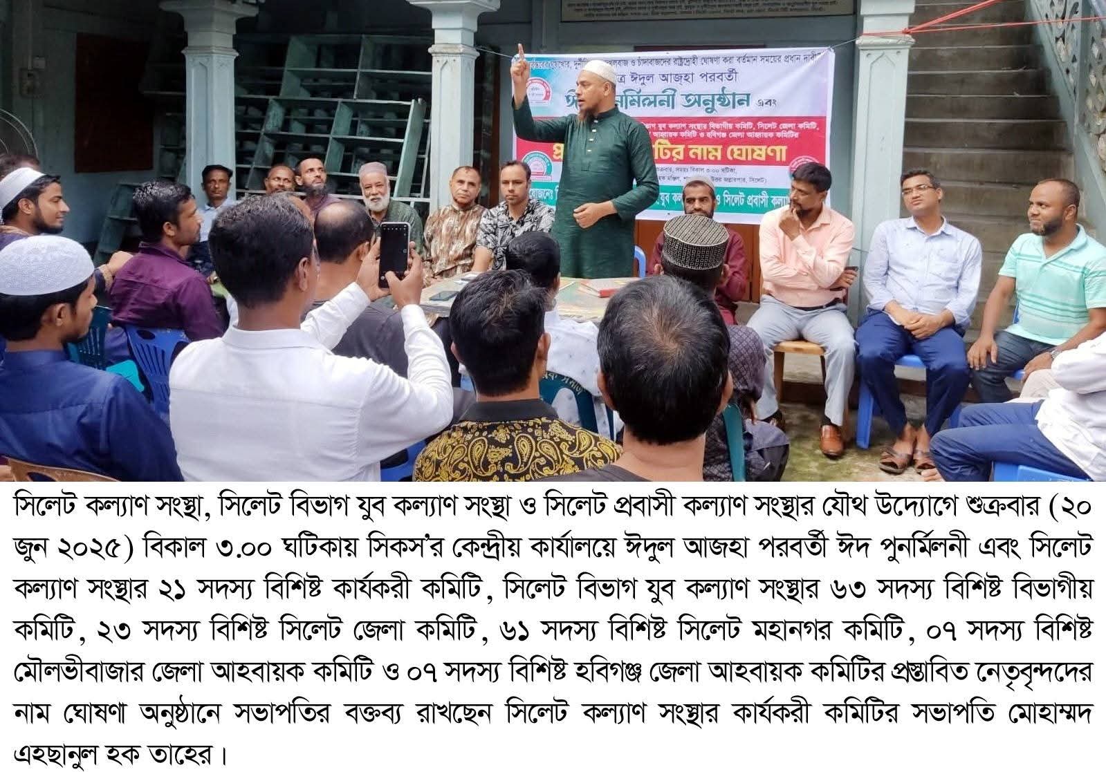 সিলেট কল্যাণ সংস্থা, সিলেট বিভাগ যুব কল্যাণ সংস্থা ও সিলেট প্রবাসী কল্যাণ সংস্থার যৌথ উদ্যোগে শুক্রবার (২০ জুন ২০২৫) বিকাল ৩.০০ ঘটিকায় সিকস’র কেন্দ্রীয় কার্যালয়ে ঈদুল আজহা পরবর্তী ঈদ পুনর্মিলনী এবং সিলেট কল্যাণ সংস্থার ২১ সদস্য বিশিষ্ট কার্যকরী কমিটি, সিলেট বিভাগ যুব কল্যাণ সংস্থার ৬৩ সদস্য বিশিষ্ট বিভাগীয় কমিটি, ২৩ সদস্য বিশিষ্ট সিলেট জেলা কমিটি, ৬১ সদস্য বিশিষ্ট সিলেট মহানগর কমিটি, ০৭ সদস্য বিশিষ্ট মৌলভীবাজার জেলা আহবায়ক কমিটি ও ০৭ সদস্য বিশিষ্ট হবিগঞ্জ জেলা আহবায়ক কমিটির প্রস্তাবিত নেতৃবৃন্দদের নাম ঘোষণা করা হয়। ঈদ পুনর্মিলনীতে বক্তারা বলেন, ঈদুল আযহার প্রকৃত ত্যাগ প্রত্যেক মানুষের মধ্যে জেগে উঠলে আমাদের দ্বারা কোনো অন্যায় কাজ সংগঠিত হতে পারে না। সিলেট কল্যাণ সংস্থা প্রতিষ্ঠালগ্ন থেকে যুবদেরকে প্রকৃত দেশপ্রেমিক, সমাজকর্মী ও নৈতিকতায় বিশ্বাসী হিসেবে গড়ে তুলার জন্য কাজ করে যাচ্ছে।