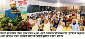 তিনি শুক্রবার রাতে নগরীর দক্ষিণ সুরমার কায়েস্তরাইল এলাকায় সিলেট মহানগরীর দক্ষিণ সুরমা থানার ২৫নং ওয়ার্ড জামায়াত আয়োজিত ঈদ পূণর্মিলনী অনুষ্ঠানে প্রধান অতিথির বক্তব্যে উপরোক্ত কথা বলেন। ওয়ার্ড সভাপতি এম.এ ওয়াদুদের সভাপতিত্বে ও সেক্রেটারী জাবেদ আহমদের পরিচালনায় অনুষ্ঠিত ঈদ পূণর্মিলনী অনুষ্ঠানে বিশেষ অতিথি হিসেবে বক্তব্য রাখেন মহানগর জামায়াতের নায়েবে আমীর ড. নূরুল ইসলাম বাবুল, বাংলাদেশ ইসলামী ছাত্রশিবিরের সাবেক কেন্দ্রীয় আইন সম্পাদক ও সিলেট মহানগর ছাত্রশিবিরের সাবেক সভাপতি এডভোকেট আনোয়ারুল ওয়াদুদ টিপু, সিলেট মহানগর শ্রমিক কল্যাণ ফেডারেশনের সভাপতি এডভোকেট জামিল আহমদ রাজু।
