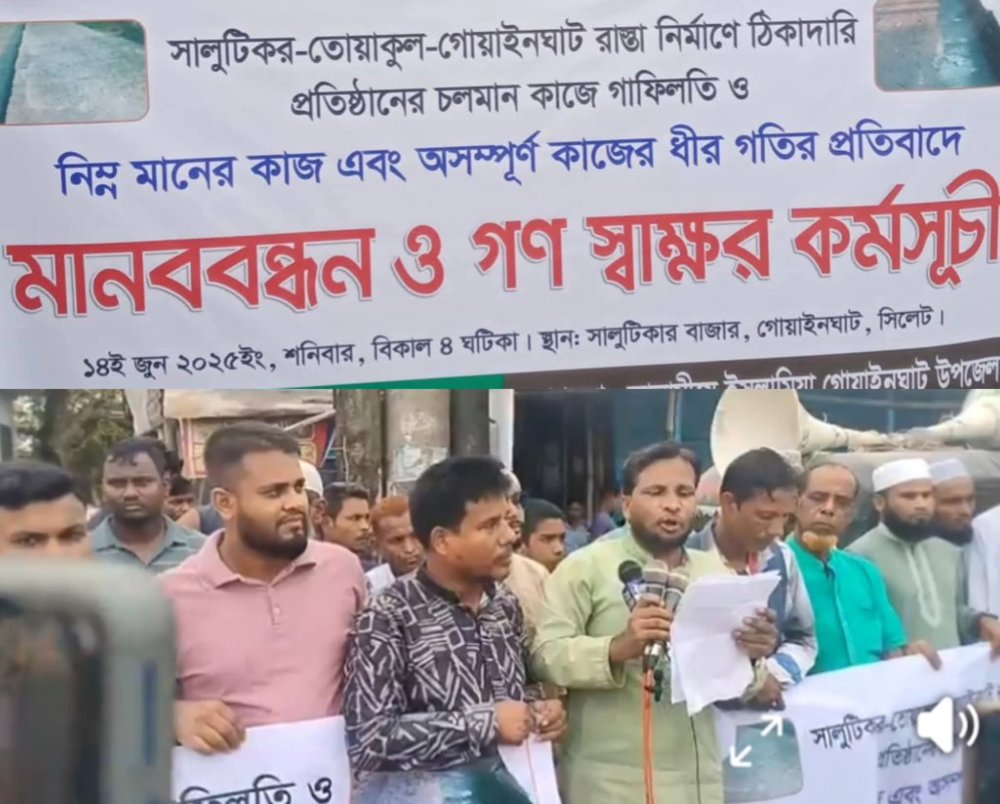 সালুটিকর-গোয়াইনঘাট রোডের কাজ অবিলম্বে পুনরায় শুরু করে আগামী ২৪দিনের মধ্যে সমাপ্তী না করতে পারলে কঠোর কর্মসুচীর হুশিয়ারী দিয়েছেন এলাকা বাসী।