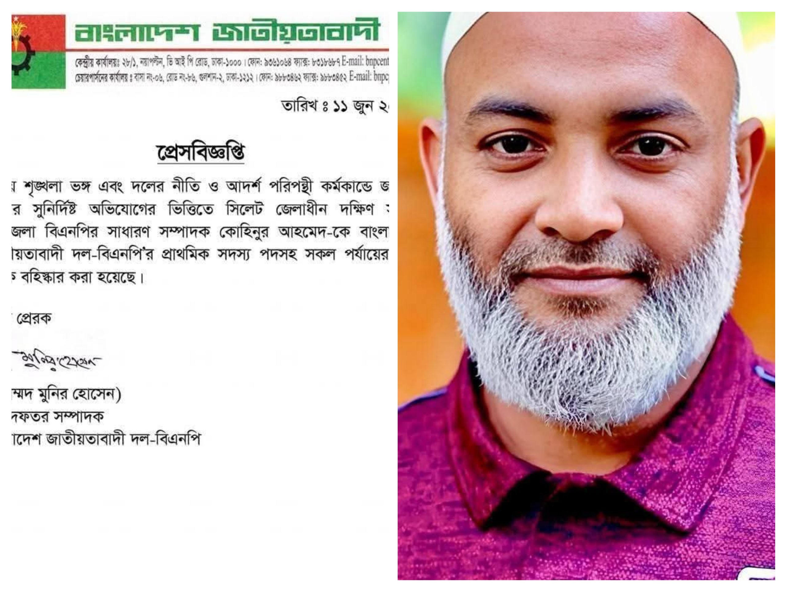কেন্দ্র থেকে পাঠানো বিজ্ঞপ্তিতে বলা হয়েছে- ’দলীয় শৃঙ্খলা ভঙ্গ এবং দলের নীতি ও আদর্শ পরিপন্থী কর্মকাণ্ডে জড়িত থাকার সুনির্দিষ্ট অভিযোগের ভিত্তিতে সিলেট জেলাধীন দক্ষিণ সুরমা উপজেলা বিএনপির সাধারণ সম্পাদক কোহিনুর আহমেদকে বিএনপির প্রাথমিক সদস্য পদসহ সকল পর্যায়ের পদ থেকে বহিস্কার করা হয়েছে।’