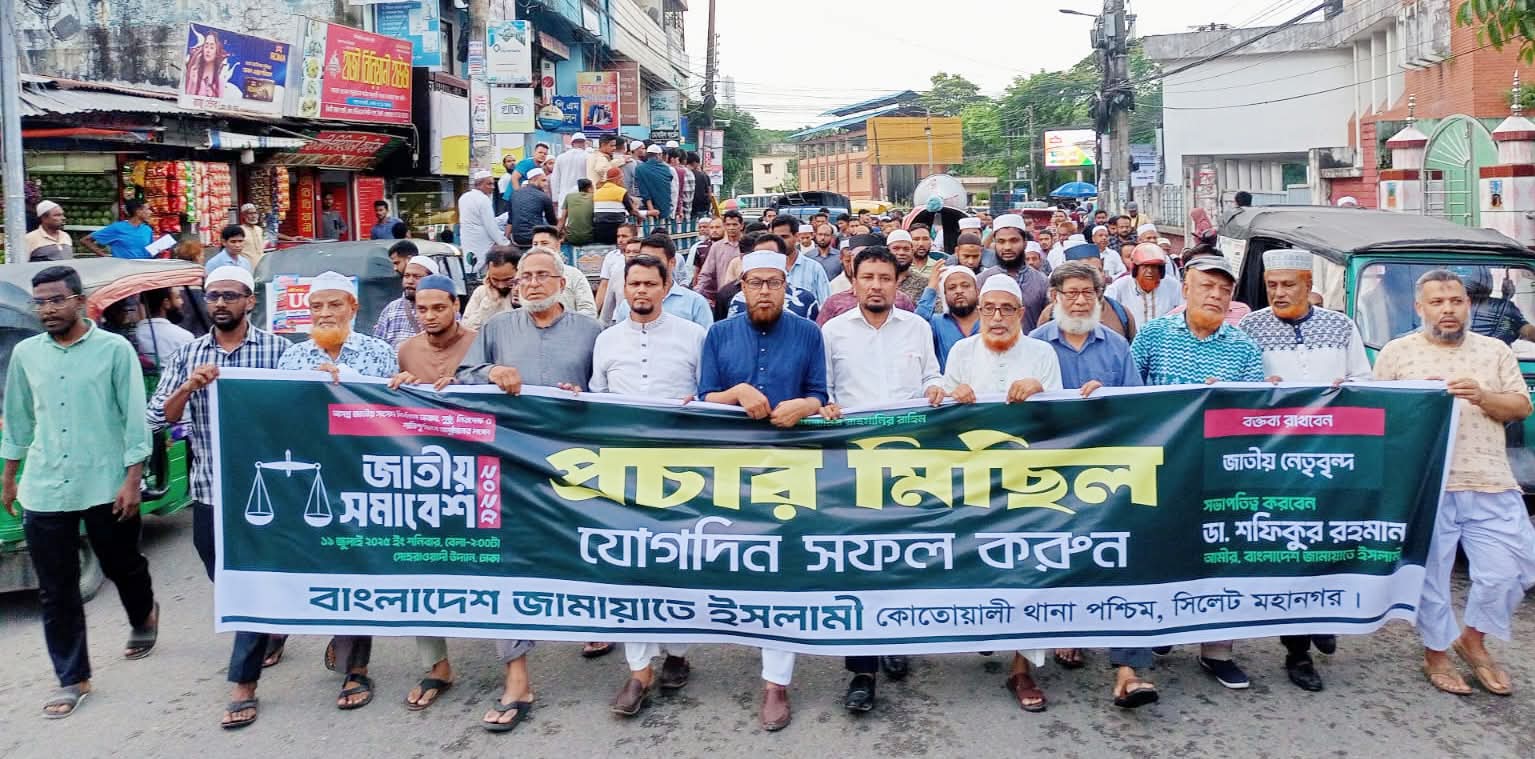 তিনি মঙ্গলবার (১৫ জুলাই) বিকেলে নগরীর রিকাবিজাবারে আগামী ১৯ জুলাই ঢাকায় জামায়াতের জাতীয় মহাসমাবেশ সফলের লক্ষ্যে সিলেট মহানগরীর কোতোয়ালী পশ্চিম থানা জামায়াত আয়োজিত প্রচার মিছিল পরবর্তী সংক্ষিপ্ত সমাবেশে প্রধান অতিথির বক্তব্যে উপরোক্ত কথা বলেন। মিছিলটি মঙ্গলবার বাদ আছর নগরীর রিকাবিবাজার পয়েন্ট থেকে প শুরু হয়ে নগরীর গুরুত্বপূর্ণ পয়েন্ট প্রদক্ষিণ করে জিতু মিয়ার পয়েন্টে গিয়ে সংক্ষিপ্ত সমাবেশের মধ্যে দিয়ে সমাপ্ত হয়। মিছিলে কোতোয়ালী পশ্চিম থানার সকল ওয়ার্ড-ইউনিটের সর্বস্তরের জনশক্তি ছাড়াও বিপুল সংখ্যক ছাত্র-জনতা অংশ নেন।