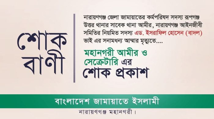 শোক বার্তা এডভোকেট ইসরাফিল হোসাইন এর মায়ের মৃত্যুতে মহানগর জামায়াতের শোক। বুধবার ১৮ জুন সকালে বাংলাদেশ জামায়াতে ইসলামী নারায়ণগঞ্জ জেলা কর্মপরিষদ সদস্য, রূপগঞ্জ উত্তর থানা সাবেক আমীর ইসলামি ছাত্রশিবির এর