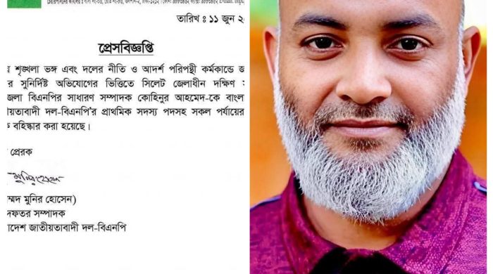 সিলেটে বিএনপি নেতা বহিস্কার সিলেটের উপজেলা বিএনপির সাধারণ সম্পাদককে বহিস্কার করা হয়েছে। বুধবার (১১ জুন) দলীয় শৃঙ্খলা ভঙ্গের অভিযোগে তাকে বহিস্কার করা হয়। বিএনপির কেন্দ্রীয় সহ-দফতর সম্পাদক মুহাম্মদ মুনির হোসেন